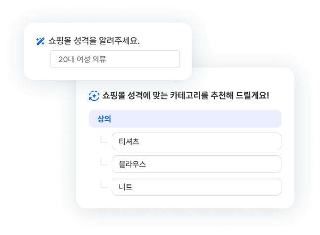 쇼핑몰의 성격에 딱 맞는 카테고리로 간편하게 만들어보세요. AI가 적합한 상품 카테고리를 제안해 드립니다.