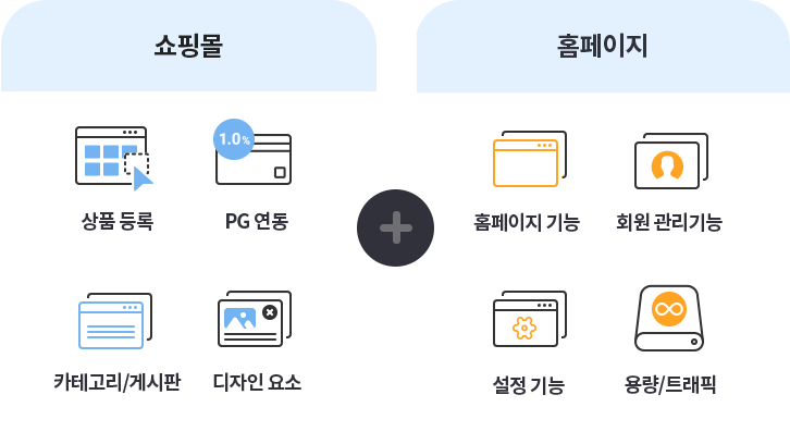쇼핑몰에 꼭 필요한 커머스 기능을 모두 담았습니다. 간단한 클릭 몇 번으로 나만의 특별한 쇼핑몰을 제작할 수 있습니다.